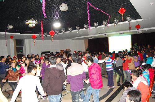 19:00主持人一段简短的开场白后,灯光瞬时熄灭,霓虹灯闪烁,“吸血鬼”华丽登场,警告大家他的猎物在舞会后会消失地无影无踪。舞会正式拉开帷幕,DC舞团为大家带来了一次视听盛宴:两对倩影的柔美华尔兹,激越群舞的平四,恶魔劫走公主、二女争仆的三人恰恰,还有围歼恶魔拯救公主、感化吸血鬼的探戈舞曲,赢得了阵阵热烈的掌声。当“王子”下跪送“公主”礼物时,现场更是尖叫连连、情绪高涨。现场的大屏幕一直滚动播放着大家的祝福短信,主持人每隔十分钟会念一次短信,使现场充满温馨。
