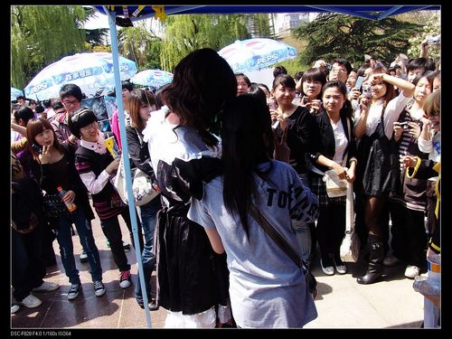 适逢交大开放日,交大校园内前来观景赏花的人流不断。在距交大北校门不远的腾飞塔广场,搭建着供表演用的露天舞台,以及十数个为参展社团准备的遮阳帐篷。新鲜空气动漫社在较久的公交行程后,不言疲惫,迅速布置好了别具特色的社团展位,开始了一整天的社团互动展示。本次巡展活动中,我社以社员动漫制作、Cosplay静态展示为主。展位上张贴、摆放着的社员绘制的海报与亲手制作的动漫人物纸模,吸引着过往观众以及其他社团的成员前来参观交流。而在活动开始不久后,轮流上场的Cosplay展示让新鲜空气动漫社展位的人气迅速上升。希望拍照及合影的观众络绎不绝,社员们也尽全力满足大家伴随着欣赏与赞许的友好要求。本次活动中,新鲜空气动漫社共推出了女仆、伪娘、《机动战士高达》军人、《化物语》篮球少女等Cosplay角色展示,大受欢迎。年轻的大一社员们在活动中不仅尝试了各种别有趣味的工作,更对一个有机社团合理运作的要素有了更实际的了解。