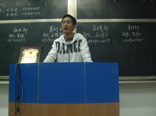 7点30分,大会正式举行,首先由主持介绍了大会流程,让在场的每一位都了解大会流程。紧接着是主席团发言,首先由主席王天祥发言,介绍了社团宗旨以及社团今后要举行的活动及发展方向,接着是副主席文宏建和王顺发进行了发言,分别就社团发展及一些经验进行了讲说,我们还邀请了嘉宾,创业协会主席张宇波,红楼文化社副主席张磊,他们也分别进行了精彩发言,使大家都受益匪浅。其次是各部门部长就部门职责进行了简要介绍,其中比较突出的是实践部部长,他不仅对部门进行了简要介绍,还提出了部员应该满足的要求,并对今后的发展做了详细的讲说。大会最精彩的部分是接下来的会员进行自我介绍,并竞选各部门的副部长。在这一环节,会员们不拘束,介绍了自己的爱好以及对社团的发展认识,各部长及主席分别对竞选者进行了提问,从中我们也发现了不少人才。后来因有事迟到的社员们也都纷纷上台竞选,看到这一点,我们都很高兴。由于上一届主席刘源晚上有事,在大会结束前赶到会场,在他精彩的发言下结束了本次大会,本次大会持续了接近两小时。