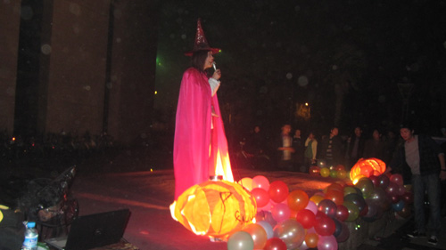 晚会举行时,广场成了欢乐的海洋。现场闪着鬼眼的南瓜灯,着黑披风飘荡着的魅影告诉人们这是一个特殊的万圣之夜。 一支支舞曲接连响起,旋转跳动的身影令人眼花缭乱;舞动的热情令人跃跃欲试;互动游戏更激发热情。所有的一切赶走了夜的寒,点亮了夜的黑。不管是否认识,也不管是否会跳,都聚在一块,尽情释放着青春的活力。晚会持续到21:00结束。