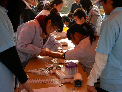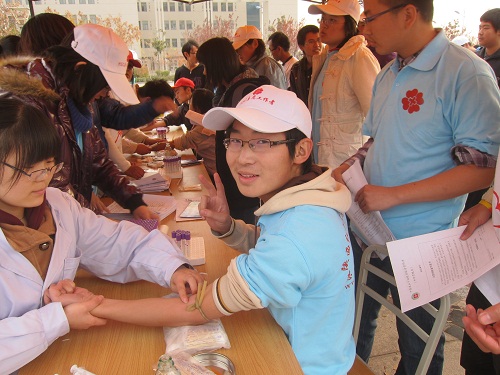 9点整,陕西省红十字会的老师和护士来到渭水校区树蕙园广场,活动正式开始。首先希望阵营的15名会员表演了手语《阳光总在风雨后》,温暖了现场的气氛。活动现场设有咨询处,报名处,血样采集出,发放荣誉证书和奖品出,约有100名希望阵营的社员参见了此次活动,各部门各司其职,活动有条不紊的开展。活动以开始,前来报名参加活动的同学旧络绎不绝,在造血干细胞血样采集处前排起了长长的队伍,有的班级还集体来到活动现场进行造血干细胞的血样采集,为那些患者献出了自己的一份爱心。同时,纸鹤横幅签名活动也在进行,每一个志愿者捐献血样后都在横幅上写上了自己的名字。活动在各界产生的影响广泛,西安晚报、校广播台及校电视台均来到现场采访,西安电子科技大学和西安石油大学的相关社团也纷纷派代表前来观摩学习。