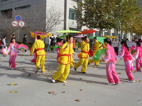 巡演由文仪部、秧歌队、剪纸队、民歌民乐队和腰鼓队组成。始发地为图书馆前的广场。组好队后,随着一声哨响,巡演队出发。沿着修远大道一路向西区食堂广场走去。到达广场后,进行了每个部的演出。表演节目主要有文仪部的风采展、扭秧歌,各色剪纸的展示,民歌、舞蹈、安塞腰鼓。演出十分精彩,特别是腰鼓队。打出了黄土地的热情与豪迈,深受大家的喜欢与欢迎。秧歌队是今年新组成的一个队伍,却丝毫不逊色,喜庆的表演令大家眼前一亮,幽默开心的动作令大家合不拢嘴,表演之中不时的赢来阵阵掌声。剪纸部也不令大家失望,一块块展板上贴满了精美的剪纸,让参观者赞不绝口。之后,整个队伍又返回,在沿修远大道到东区食堂广场进行演出,同样赢得了观众的声声喝彩。