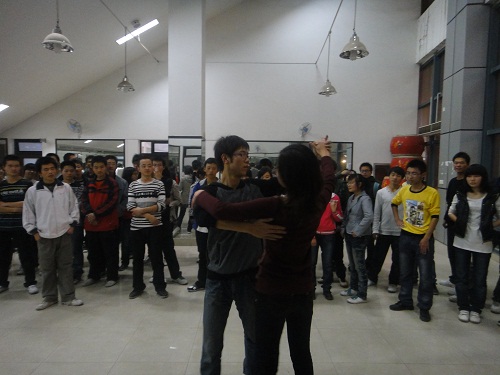 6点50分,到场的部长及干事已经把会场灯光及音响布置好。7点整,舞会正式开始。首先,按照惯例,全体会员及干事集体跳慢摇。随着熟悉的音乐声响起,极具动感的秧歌步慢慢地调动起了大家的舞蹈热情。接着是直线八步和十六步,音乐依然是那么震撼人心。两轮热舞过后,所有人身上的寒气都一扫而光,换歌的时候已有不少人把身上的大衣脱下了。接着,大家便开始学习新的舞步——恰恰。如果你听了跳恰恰时的音乐,身体肯定会不由自主地动起来。跟着短音的旋律音符,感觉双脚是擦着地面前进,大家都被这种活泼、热烈、俏皮的舞步吸引住了,学习热情非常高涨。