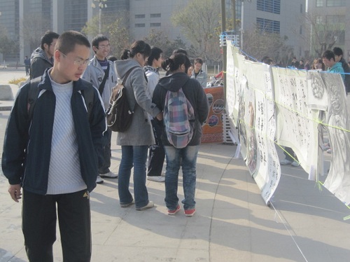 上午10时,书画协会主席、各位部长及会员到达逸夫图书馆前广场并开始画展的布置工作,活动正式开始。伴随着会员们忙碌的身影,一幅幅书画佳作露出了庐山真面目,早已有迫不及待的同学上前一看究竟,画展现场顿时热闹起来。前来观看的同学络绎不绝,他们有条不紊、秩序井然的逐一欣赏,不放过一处妙笔;忙碌不停的部长及会员们也都各司其职,他们向到场的同学们表达诚挚的谢意与热情的欢迎,并为其介绍书画的内容,解答相关疑问,不敷衍每一位参观者。虽然天公不是很作美,但严寒与北风无法冻结同学们对书画艺术的向往之情;虽然许多同学当日还有课,但忙碌的日程无法阻挡他们对书画艺术的流连之意。连广场上的喷泉也来助阵,水花与水雾映衬出颇具意境的背景,使得展览现场成为一个名副其实的水墨的世界、山水的世界。溅出的水滴仿佛都带有墨色,吹过的微风仿佛都带有墨香。同学们身临其境,似乎进入古典艺术的世界。见识了妙笔丹青的同学们奔走相告,也引来许多慕名而来的同学。在一天的时间内参观人数并未减少,同学们依旧保持着高昂的情绪。整个长安大学都氤氲在充满诗意的墨韵之中。