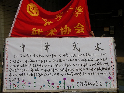 盛会从早8:00到下午2:00结束。早上7:00由组织部将8块宣传展板、3副条幅表演器具、音响、电脑、活动礼物及其他所需工具运到活动场所,并进行高效有序的活动会场安排。早上7:30所有武术协会部长、干事及会员准时到达活动广场,并由秘书处统一进行签到表签到。