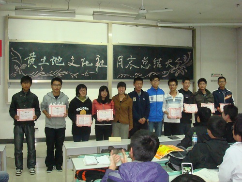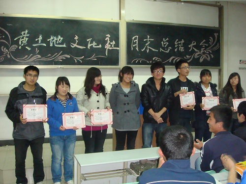 首先,主持人致开场词,各部门负责人上台分别总结了上个月的工作及为黄土地文化周筹办的情况。通过对前段工作的认真总结与反思,对下一步社团工作做了有针对性的安排,让大一的社员对自己有了更准确的定位。接着,两位理事着重对黄土地文化周进行了总结,对我社团的精心准备组织工作表示肯定,并对今后的工作提出了进一步的要求。两位理事轻松幽默的话语带动了全场活跃的气氛,博得一片掌声和笑声。大会继续在喜悦的气氛中进行,主席和副主席为在黄土地文化周中表现突出的部门及个人颁发奖状及获奖证书,全场掌声雷动,为给黄土地做出突出贡献的成员们送上衷心的祝贺!大会最后一项,薛双祥主席作总结发言,在表扬的同时也严厉的指出了社团只能够普遍存在的问题,希望各位社员能积极重视,为把我们黄土地文化社建设的更加优秀而努力。