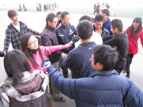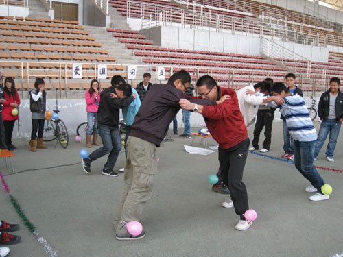 歌曲结束后,各位参加联欢活动的同学又玩了“二十人二十一足”、“盲人穿拖鞋”、“心解千年结”等游戏,目的是让各位同学彼此有更进一步的了解,也对各少数民族的风俗习惯有一个初步的认识。
