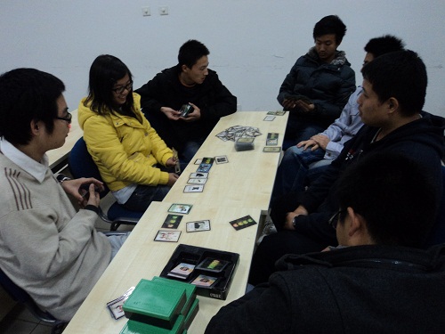 本周六晚7:00,“杀”棋充满了社团活动室,前来活动的同学各自分组后便迫不及待的杀做一团。可以看出,无论新手老手,对三国杀的热情日益高涨。在前两次活动中,初学者需要高人在旁指点,他们对武将技、锦囊及属性杀等的使用还不是很熟练,只能接受高手的说法来出牌,从中体会游戏的机巧。而在昨天的活动中,新手们的动作已相当熟练,并懂得掩饰身份,使用计谋。于是乎,昨天的活动格外有趣:忠臣装作反贼,笑里藏刀,出其不意的给反贼致命一击;反贼费劲心机,用阴谋、阳谋、明枪、暗箭,希图致主公于死地;最深藏不漏的是内奸,时而隔岸观火,坐收余利,时而丢一张杀,使别人摸不着头脑。