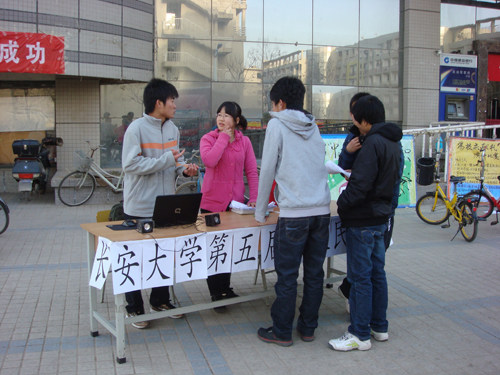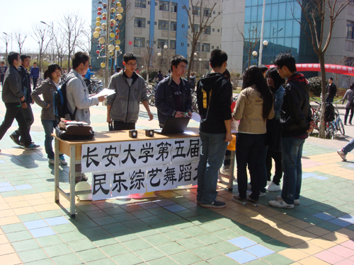 3月16日 ,由黄土地文化社承办的“长安大学民歌民乐舞蹈大赛”正在火热报名中。东西区食堂门口设立的咨询点前往咨询的人来去纷纷,同学们都对这陌生而又熟悉的民间艺术满怀好奇与热情。