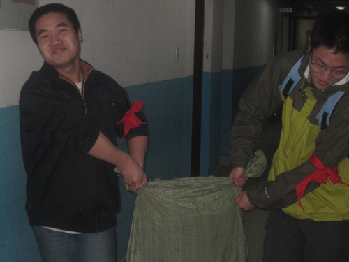 此次活动从下午6:30开始,由“爱心储蓄”项目组组长靖雪菲负责,各爱心小分队抵达宿舍楼下,紧接着每个小组朝着指定的楼层开展活动。由于之前的宣传工作有一定成效,“爱心储蓄”活动深入人心,爱心小分队每到一处,都得到积极响应,各宿舍同学将平日收集的塑料瓶倒向爱心袋中,将点滴之爱汇聚成河。