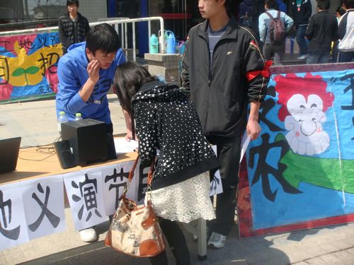 作为校园十佳社团的精品活动,“五一”工地义演活动已经连续几年受到好评,并曾被《华商报》进行报道。它以其自身的魅力吸引着长大学子。能够在展现自己的同时让别人感到温暖,广大同学们表现出了很大的积极性。在《切格瓦拉》的歌声中,同学们纷纷向支农的志愿者们咨询晚会的具体事宜并且踊跃的报名参加活动。没过多久,节目征集单上已经出现相声、歌曲、舞蹈等多种形式的节目。有的同学在自己报参加的同时还向我们的支农人要了活动的宣传单。