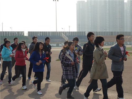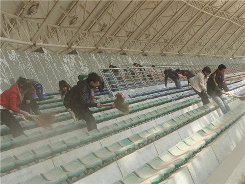 春寒峭料,在主席杨俊的带领下我们全体干事在运动场晨跑,以此为团日活动热身。随后又在他的带领下,我们高唱《切格瓦拉》。届时,高昂激情的歌声响彻整个运动场。整个热身活动使干事们志气大振。随后,全体人员各自拿着抹布、拖把、水桶等工具开始在观众台上认真打扫。寒风阵阵,灰尘飞扬,干事们没有退缩,每个人都在仔仔细细的清洗这每一个座位。在到扫观众台时,干事们相互沟通,相互学习,整个活动过程紧张但又十分活跃和温馨。历经两个多小时的并肩努力,我们终于将观众台清理干净。看着一个个被清理得一尘不染的椅子,干事们都露出了笑容。