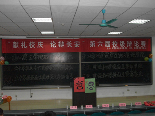 4月20号晚,长安大学哲思协会“迎六十年校庆”主题辩论赛于图书馆东侧1102教室继续火热进行。出席这次辩论赛的嘉宾有各学院主席、校辩论队优秀辩手,哲思协会主席等,还有各个学院的拉拉队。