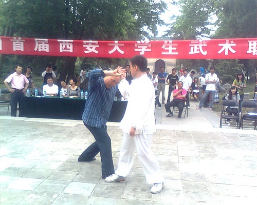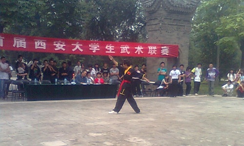 首届西安市大学生武术联赛于2011年5月28日在小雁塔拉开序幕,此次活动由西安大学生武术文化交流联盟主办,西安武术运动协会、西安高校武术联合会、西安红拳馆协办。到场的嘉宾有陕西武术协会办公室主任张世昌,洪拳馆馆长高建武,西北棍协会长张洪刚等等名家。参加本次联赛的高校有西安交通大学学生武术协会,西安电子科技大学武术协会,西安理工大学高科学院武术协会,西安工业大学精武双截棍协会,西安翻译学院武术协会,思源华武协会双节棍队等。 十点三十分在各位嘉宾致辞之后,红拳馆馆长高建武宣布比赛正式开始,场下准备已久的选手们个个摩拳擦掌,跃跃欲试。首先上场的是西安工业大学选送的精武双节棍团体及个人,选手孙一畅凌厉的动作,灵活的身法赢得了场下的阵阵掌声。接下来是由西安电子科技大学选送的八极拳,选手崔睿彧表现优异,并获得了裁判高建武的好评。之后西安交通大学武术协会的洪拳、太极,陕西科技大学武术协会的苗刀、八极拳老夫宝,齐眉棍、查拳等给现场的观众带来的强烈的视觉震撼和心理冲击。