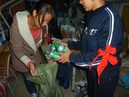 虽然本次活动由于与运动会的时间起了冲突导致宣传效果不理想,但这却丝毫不影响这次活动的进行。每当会员们礼貌地敲门进入宿舍时,同学们都会很积极的将废弃塑料瓶等捐献给我们。有些宿舍门上还贴着由支农志愿者协会去年颁发的“爱心储蓄”积极宿舍的奖状,正是有他们长久以来的支持,才能使我们的活动越办越好。最让我们惊奇与欣喜的是,许多宿舍都把废瓶子等收集起来等着我们去收集,其中一个宿舍竟一连装了8大麻袋的旧瓶子。而有的宿舍虽然没有旧瓶子,但也积极地翻出自己的旧衣服捐给山区的孩子们。