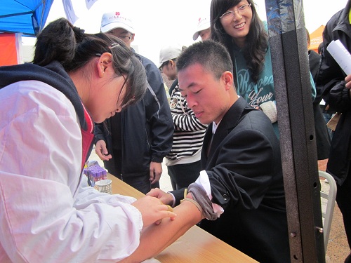 虽然天气有些阴沉寒冷,还飘着细雨,但丝毫没有影响到同学们的捐献造血干细胞的热情。两列长长地纵队中传来的是最真挚的笑脸,最坚定的眼神。捐献者们耐心的排着长队,完全没有抱怨的情绪,浓浓的爱心奉献之举,使得现场的气氛一直被温馨和欢乐笼罩着。他们对造血干细胞活动的了解与支持,相信会使得更多的生命获得康复的希望。
