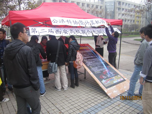 2011年11月16日11:00,我计算机协会和公路科协在西区食堂门口联合举办了第二届西安高校联合电脑文化艺术节宣传活动。此次西安高校联合电脑文化艺术节由西北大学主办,协办活动的其余五所高校为长安大学、西安交通大学、西北工业大学、西安电子科技大学、陕西师范大学。