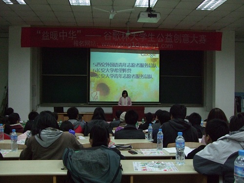 2011年11月21日,由西安交通大学英仔爱心社承办的西安高校公益社团交流会暨第五届“益暖中华”谷歌杯创意大赛宣讲会在西安交通大学中二1200教室圆满举行。我校希望阵营一行七人参加了此次会议。本次会议由西安交通大学仲英学院团工委主办,西安交通大学英仔爱心社承办,到场的嘉宾有西安交通大学仲英学院团工委副书记张瑞等团委老师,谷歌中国“益暖中华”两名相关负责人,西安交通大学英仔爱心社社长,以及来自不同高校的十二个公益社团代表。
