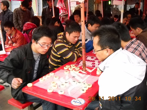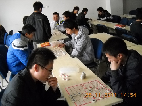 比赛于26日上午9:30正式开始。第一场比赛为淘汰赛,共两轮,均是一局定输赢,可谓竞争异常激烈。上午在西街七杯茶比赛,寒风凛冽,但选手们个个士气高昂,充满自信,从他们那敏锐的眼光中就可看出,再冷的天气也冷却不了他们那炙热的内心以及那不到最后一刻绝不轻言放弃的信念。第一轮结束,获胜的选手浮出水面,然后进入下一轮的比赛。第二轮更是招招惊险,落子无悔,稍不注意,就“战死沙场”。下午2:30左右,是大赛的预赛阶段,在社团活动室正式进行。这不比淘汰赛,更是高手过招,非同一般。且看,双方均剩下一车一兵,可谓旗鼓相当,谁也不退让。卒子过河半条车,这不是夸张,当卒子深入敌后的时候,你才会发现他的危害,所以不可轻视小人物,在微不足道的人物终有一天会成为制胜的关键。