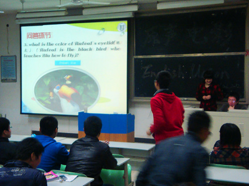 周六晚七点前,同学们陆续来到教室,七点整,原声电影活动正式开始。首先,两位主持人对各位同学的到来表示欢迎,并对影片进行了全英文式的简单介绍,随后影片开始放映。这次给大家欣赏的是好莱坞经典喜剧大片《里约大冒险》,该片讲述了一个名叫布鲁的蓝金刚鹦鹉在巴西里约一系列天马行空、阴差阳错的冒险故事。影片高清的动画效果、色彩斑斓的动画形象、动感的音乐和巴西特有的文化氛围绝对是一场不容错过的视听盛宴。生动的故事情节以及夸张幽默的翻译使得现场不时笑声大起。影片的最后,可爱勇敢机智的布鲁收获了爱情,回到了温暖熟悉的家中。影片结束后,主持人组织进行了电影配音活动,对影片中的一些细节镜头进行提问并颁发了奖品。这次活动在影片动听的歌声环绕中圆满结束了。