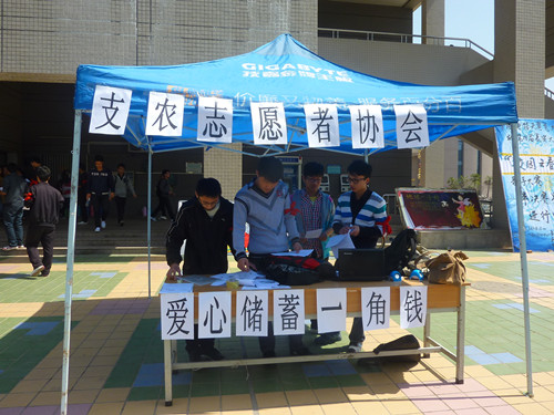 奉献点滴爱心,汇成一片希望。2011年3月31日,支农志愿者协会“一角钱”工程正式启动,同时,宣传活动在东西区食堂广场同步进行。“一角钱”活动是支农志愿者协会最新构想的一个工程,通过向各志愿宿舍发放“爱心储蓄罐”,收集同学们平时不用的一角钱,积少成多,捐献给社会上的爱心组织和边远山区的孩子们。