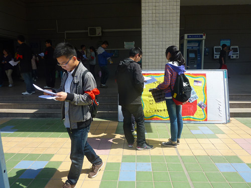 上午7:30,支农人早早在东、西区广场搭起帐篷,设立了宣传点。根据学校的具体情况,本次宣传活动的重心放在了中午与下午的下课高峰期。11:30,支农人左臂上系着红领巾,分别聚集在东、西区宣传点开始进行本次宣传活动。通过志愿者们宣传介绍此次的“一角钱”工程,同学们纷纷到宣传报名点了解详细情况并填写表格。许多同学都非常支持此次活动,因为这即能为他们收集起平时在宿舍乱扔的一角钱,还能为公益事业做出一份贡献。得益于支农人耐心的宣传介绍与广大同学们的支持,6:30,本次宣传落下了帷幕。