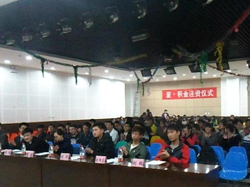 2012年3月28日晚7时,长安大学希望阵营第四届“爱·积金”注资仪式在朝晖大学生活动中心三楼多功能厅成功召开。校团委李瑾老师、学生社团联合会公益实践分会会长刘琦同学、学生社团联合会财务部部长李旭东同学、希望阵营上届秘书长兼“爱·积金”部长裴栋栋同学、希望阵营现任主席李伟同学、Dancing-club协会主席吴洋同学、Touching 曙光协会主席刘鹏同学参加了本次会议。