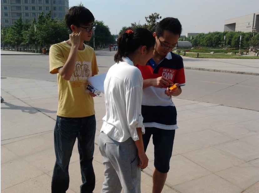 本次大赛将70组参赛选手分为两组,以长安大学图书馆前的广场定为此次大赛的大本营。上午九点整,第一组选手准时从大本营出发,根据组长抽取的四个坐标,通过GPS导航仪在校园内展开搜索,并在搜索到准确坐标的地点记录下坐标对应的汉字,当全部搜索完四个坐标之后回到大本营,向相关工作人员汇报坐标所对应的汉字,并由工作人员记录该组所用时间。大赛在紧张有序的进行着,第二组选手于上午十点半从大本营出发,开始搜索所抽取的坐标对应点。工作人员开始进行相关参赛人员的数据统计,随着第二组选手的陆陆续续的回到大本营,本次大赛也于中午一点落下帷幕。