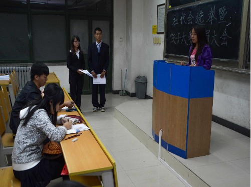 10月15日晚7点半前半个小时,中华传统文化协会的主席团和各部长、干事已经早早地来到了会议地点,进行着准备活动,等到会议开始时,会场已经布置的整整齐齐,在会员们陆陆续续的到场后,中华传统文化协会主席李晓旭发表了讲话,积极动员大家发表演讲,由于大1新生们对于这一活动不太了解,所以首先就由大2的学长学姐们发表演讲,在学长学姐的带领下,大1的新同学也纷纷发表了演讲,并把名字写到了黑板上,接着便进行了紧张的投票工作。
