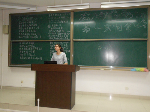 活动的开始,主席对此次例会做了总体的报告,指出了活动的意义并鼓励大家积极地投身到此次例会中去。接着,手语部部长发表了讲话,她概括了此次例会的环节,然后由她和几位手语部代表边深情朗诵边用手语为大家精彩地演绎出了歌曲《爱因为在心中》,当时场下一片宁静,所有人的目光都集中在他们的动作表演上,合着他们天籁般的朗诵之音,大家的心都被深深地触动了,然后,手语部部长让其他部门社员自愿上台学习的话音刚落,大家便踊跃的上了讲台,一时间,大家学习的积极性高涨,他们积极投入的表情让我们看到了他们为了奉献自己、关爱他人而生的那颗真挚的心,我仿佛看到了他们与残疾人交流时嘘寒问暖的场景。接下来,手语部部长将他们分组并打了一场“联谊赛”。