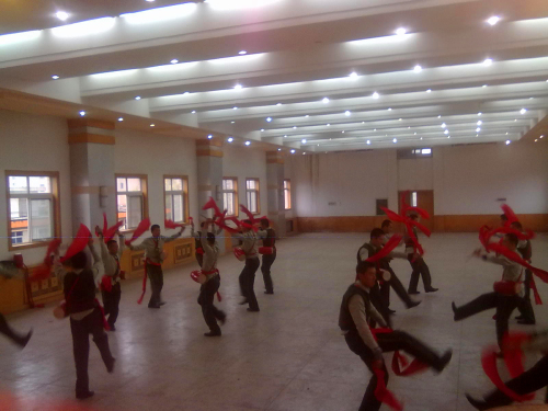 2012年11月10日早晨,黄土地文化社两名社员怀着激动的心情来到西安武警工程大学,两名社员受到了西安武警工程大学的校友们的热烈欢迎。之后,两名社员开始了为期一天的教学活动。在教学过程中,两位“老师”教得很负责,对待工作认真严谨,热心地向武警学生们传授腰鼓技能的精华,传播黄土文化。武警学员们一个个都认真学习,认真做好每一个动作,表现出很强的兴趣。