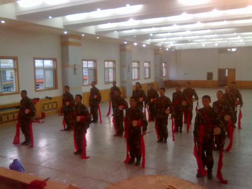 在课余时间,两名社员与武警学员们进行了亲切地交流。黄土地文化社两名社员向武警学员们阐述了长安大学的近况与黄土地文化社的发展,并且双方都进行了学习和生活上的交流,对彼此都有了一定的了解。吃过午饭后,两名社员和武警学员们经过短暂的休息之后,又开始了教学。直到下午,两名社员结束了教学课程,武警学员们都取得了很大的进步,成功的学习了腰鼓。之后,武警学员们热烈欢送两名成员,并对他们表示衷心的感谢,两名社员以敬礼的方式回谢,随后返回了长安大学。