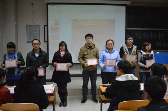 在等待评委评定最终结果的时间里,各位参赛队员与现场观众进行了才艺互动,使会场活跃幽默。之后评委经商议后对严冬阳,刘志兴等30组团队进行颁奖,将我们的大赛推向最高潮。紧接着各位参赛队员与评委合影留念。九点钟左右主持人宣布本次植物标本制作大赛圆满结束。之后我社工作人员对会场进行整理。
