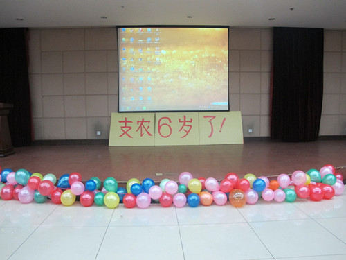 2012年12月7日,支农志愿者协会终于迎来了她的六岁生日。全体支农人在朝晖大学生活动中心三楼多功能厅为她庆生,支农09届主席杨竣、10届主席张威及两届主席团成员也来到了晚会现场,为这个他们曾经倾力奉献的组织,带来一份诚挚的祝福。