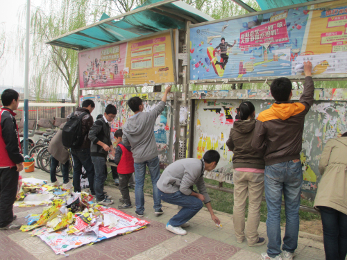 活动中,大家将各宣传栏上厚厚的长时间未清理的海报撕得干干净净,将不允许张贴广告,海报的地方用小刀刮掉,然后用抹布抹的一尘不染。并且将大量倒在地上的自行车扶好,摆放整齐等等。