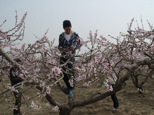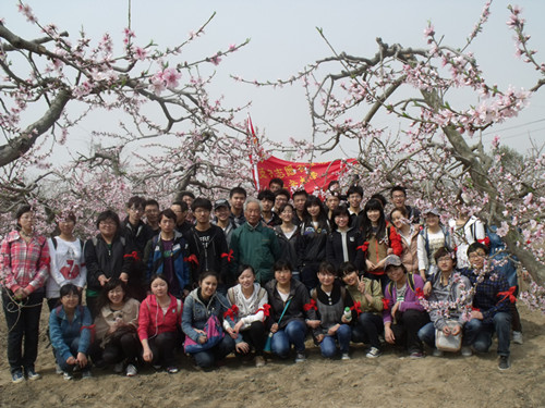 桃园的主人是一对六十多岁的周姓老夫妻,子女常年在外,了解到他们的困难后,支农志愿者协会自上年开始,组织成员帮助周大爷和周奶奶进行桃源授粉,在周大爷的亲切指导下,队员们很快就掌握了授粉技巧,三人一组开始了紧张热烈的授粉活动,期间,队员们遇到困难,周大爷总是乐此不疲的为队员们指导,虽然授粉工作并不难,但是队员们始终没有应付了事,而是认认真真一枝一枝,一株一株的完成授粉,因为他们都知道他们的授粉结果将直接影响到周大爷桃园今年的收成。在全体队员的通力合作下,中午12:10,大家顺利完成了授粉活动,并在临走前与周大爷合影留念。