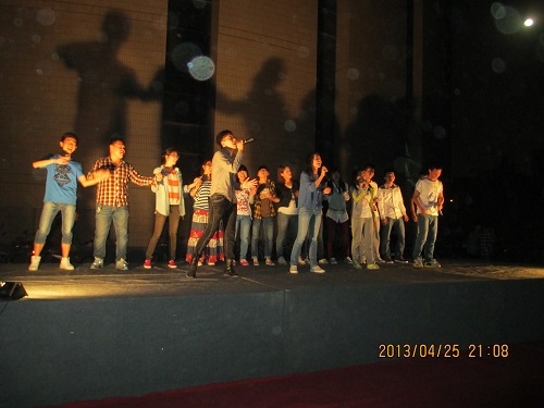 晚上七点半,彩排按照预定计划正式开始,首先是由健身交谊舞协会带来的开场舞吉特巴,随后,是由武术协会送上的精彩武术表演,接下来,还有来自西安交通大学城市学院相声小品文化社友情出演的相声,一曲深情款款的《北京北京》,具有深厚文化底蕴的秦腔表演,DancingClub献上的青春活力的快闪,精彩绝伦的抖空竹表演,慷慨高昂的二人合唱《天下无贼》,最具民族特色的新疆独舞,当然,最具代表性的还是由黄土地文化社带来的具有陕北特色的陕北腰鼓,赢得现场阵阵喝彩,紧接着是歌颂农民工的诗朗诵《转变》,手语舞《感恩的心》,以及最后的合唱《相亲相爱》。