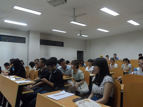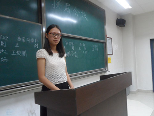 大会第三部分,有大二的主席,副主席及各位部长介绍每个职位的任务及面对的问题,由于各位都准备充分,都把自己的任务全面仔细的介绍了一下。最后,也是最重要的一部分“干事竞选”。首先是主席职位,第一个由秘书处杨斌上台,简单介绍了一下自己后,由大二的各位主席,部长提出问题,像自己做主席的优点,具备哪些优良品质等等。接着是新闻网络部单玉祥上台,主动谈了一下社团的未来及一些问题后,各位部长主席问题不断,掀起了会议的一次小高潮。由于时间有限,问题也不断重复,所以后面没有按部门竞选,而是由谁有想法就直接上台表达。会议进行三个小时,大体上把所有问题都囊括了。接着就是主席团确定人和职位了,因为这关系到社团的发展,所有显得十分重要。