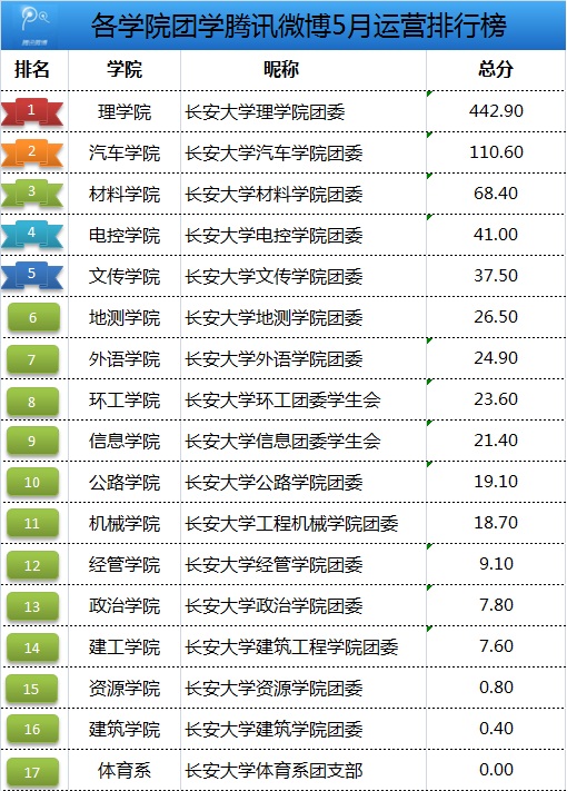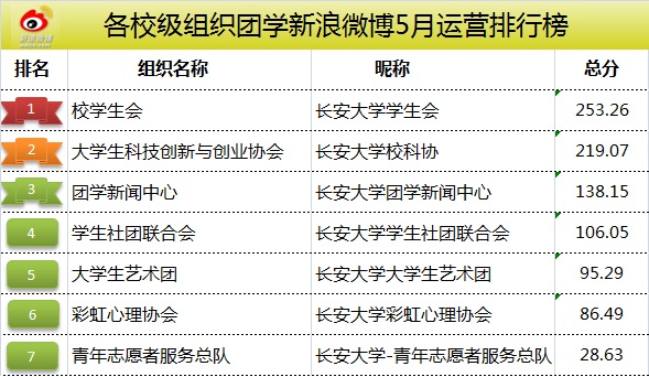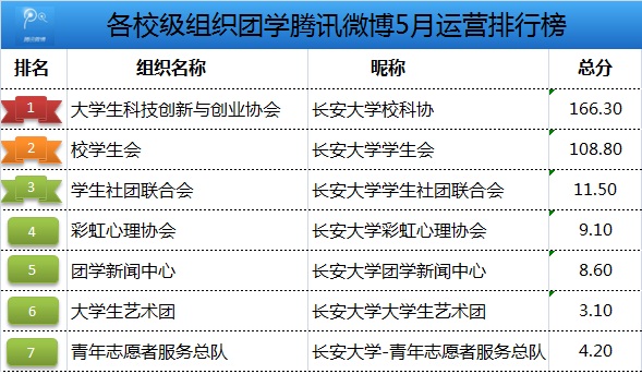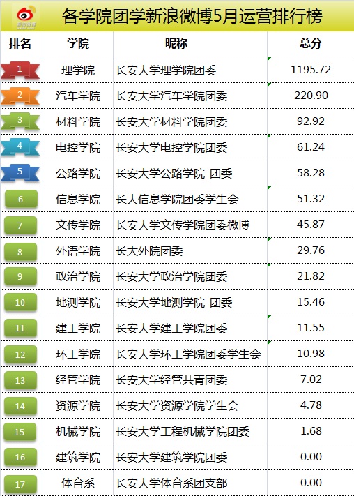 各学院(系)团委(团总支)、校级学生组织: 为适应全团工作发展需要,充分发挥新媒体在团学宣传中的重要作用,进一步繁荣我校团学官方微博校园文化,规范我校团学微博工作并组织开展团学微博考评工作。根据《长安大学团学官方微博管理办法(试行)》、《长安大学团学官方微博考评办法(试行)》,现将各学院(系)团委(团总支)、校级学生组织团学官方微博工作2013年5月考评分公布如下: