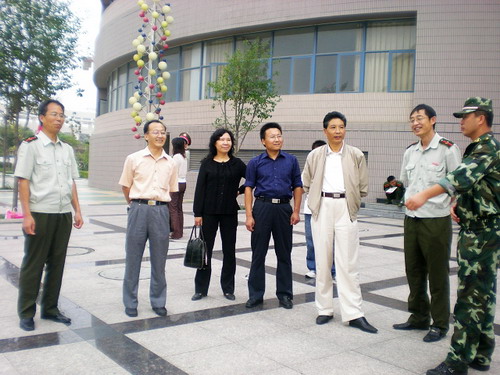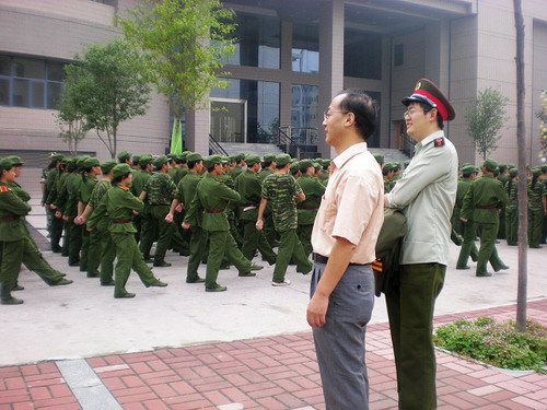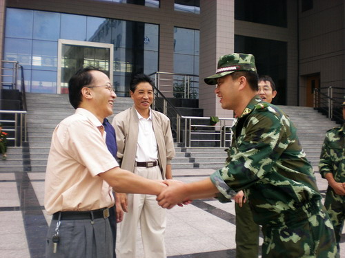 王书记和教官作了亲切的攀谈,详细了解了新生的军训进度和目前的军训情况。教官一一作了介绍,并汇报了在此前队列会操、歌咏等比赛中取得优异成绩。我院领导还饶有兴趣的观看了新生的军训表演情况。