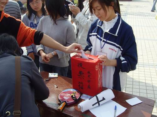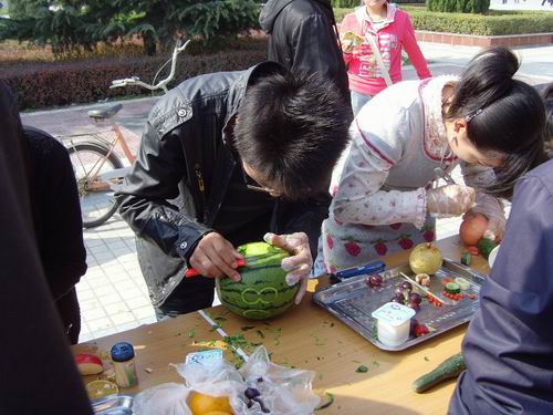 接下来的水果拼盘大赛更加另人激动,制作赛分为学院赛和个人赛,他们的创意层出不穷,不断的给人带来惊喜。紧张的制作赛中还穿插了轻松的踩气球游戏。应邀嘉宾的参加也为游戏增添了欢乐的情趣。地测学院的拼盘设计创意十足,奥运主题鲜明,荣获第一名。