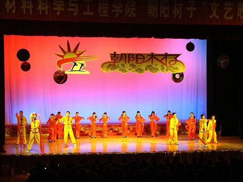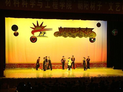 2008年11月6日晚7:00整,伴随着古典清脆的钟声,材料学院2008“朝阳材子”文艺晚会在朝晖大学生活动中心拉开帷幕。莅临本次晚会的嘉宾有:学工部副部长王冰老师,校团委副书记张骞文老师,校学生就业与发展中心副主任丁珊老师,渭水校区管委会副主任高宝军老师。材料学院党委书记王耀文老师、院长陈拴发教授、党委副书记高雁北老师、副院长刘开平老师、各兄弟学院党委副书记及材料学院院办,各系的领导老师以及各院团委书记、辅导员老师等。