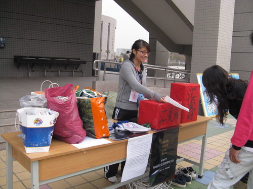 在现场,简单的两张桌子上摆着募捐箱和记录册,用于爱心物品的接收、登记和整理,桌子边放有展板、宣传画以及横幅。现场工作的人员一边向同学们发放传单,一边向大家介绍本次活动的目的及意义。现场虽然布置的很简单,但一旁那一摞厚厚的棉被衣物和那沉甸甸的捐款箱还是让人倍感温馨。