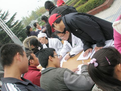 上午10:30左右,陕西省红十字会造血干细胞服务分队的采血车按时到达。于是同学们便积极的配合医生的工作,采集活动得以顺利的开展。众所周知,大学生是一个最有热情与爱心的群体。所以活动一开始,便有大量的同学冒着严寒络绎不绝的来到咨询处询问相关事宜,而且积极的配合工作人员的指导。填表,编号,一切都有条不紊的进行。