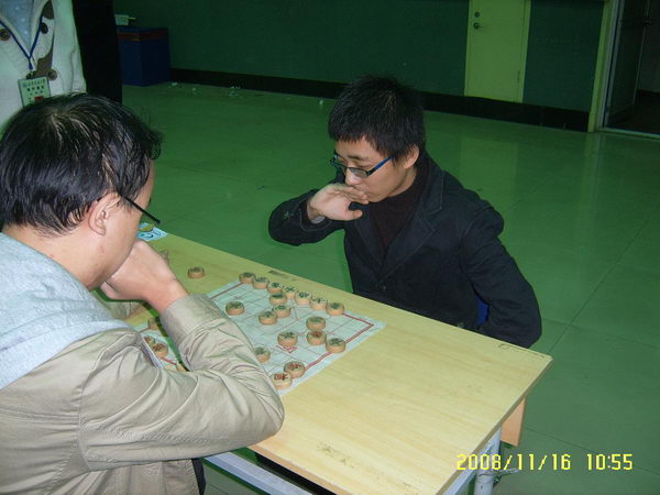 第一轮淘汰赛于10点钟正式打响。由于参赛人数众多,且赛制要求一局定胜负,所以第一轮比赛显得异常残酷。在这种只能赢不能输的气氛下,每个人都屏息以待。终于,首轮淘汰赛结束,我校参赛队的钟明,柳锴,范衍健分别战胜对手晋级下一轮。不待我们松一口气,第二轮比赛便开始了。能走到这一步,大家心里都很清楚自己的对手都是一等一的高手。棋手们凝神沉思,都想走出克敌制胜的妙招,但是这谈何容易。我校的柳锴同学在与对手苦战一个半小时后,不敌惜败。同时范衍健同学也被淘汰出局。但令人安慰的是我校的钟明同学顺利晋级。