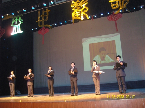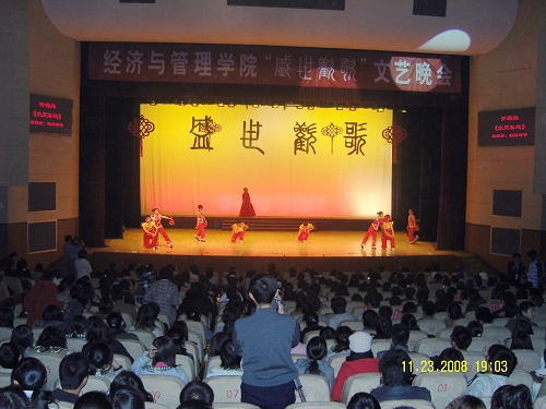 2008年11月23日晚七时,我院“盛世欢歌”2008级迎新文艺晚会在渭水校区朝晖大学生活动中心礼堂拉开帷幕。学校有关职能部门领导周国光、宋美红、李育森、王冰、张骞文,各兄弟学院领导老师,我院党政领导王福运、陈引社、张建斌、牛跃平,以及各系室教师代表等,与渭水校区1000余名同学一同观看了晚会。