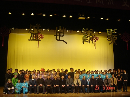 演出结束后,出席晚会的领导来宾走上舞台,与演员亲切握手,祝贺演出成功,并与全体演员合影留念。