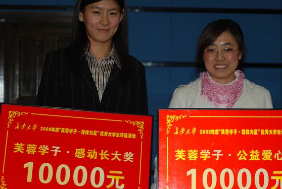 11月21日,在“芙蓉学子”的颁奖现场,十二名学生(或团体)分别获得“芙蓉学子”单项奖学金1万元的奖励。行政管理专业研究生惠霞与06级法学专业本科生朱绍明分别获得“公益爱心奖”与“感动长大奖”。