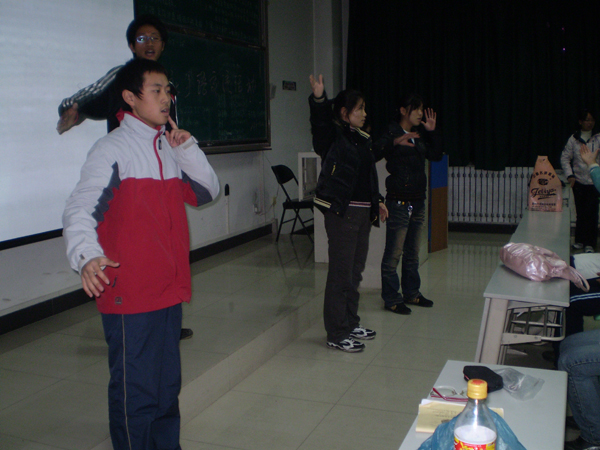 熟悉了《隐形的翅膀》之后,三位主持人又为我们介绍了一些日常用语如何用手表达。接下来进入了游戏“快乐传真”环节。同学们都踊跃上台,每一组四男四女,用手语传一句话,其间不免一些夸张之处,底下的人都开怀大笑。
