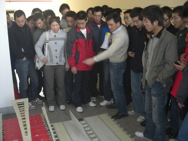 进入以后,李加武老师带领参观同学从不同的方向开始参观,老师热情,详细的为大家讲解实验室里一些设备的原理及其使用方法,同学们都很好奇,但表现除开好奇更多的是认真的观看实验设备和听老师讲解,并向老师提出了一些有独特见解的问题,老师都一一予以了解答。紧接着,老师又带大家参观了一些已建成的国内外重大建筑工程的模型,并给大家讲解了风洞试验室在这些建筑里面起到的一些重要的,无可替代的作用,同学们为之一惊,从心里佩服起它来。
